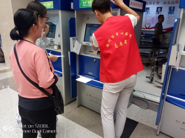 下午两点,参加志愿活动的实践部人员准时到达市四院,在完成签到、换志愿服等一系列准备后开始导医。首先,谢宇鸿向参加志愿活动的同学们详细介绍了挂号缴费自助机器的使用方法、导医过程中的注意事项并将人员均匀分配到机器前。接着,每个志愿者都耐心地接受病人的咨询,比如怎么办理就诊卡,怎么挂号,缴费,怎么打印缴费单……当看到有想要挂号看病的老人或带着孩子的妇女时,志愿者们都主动地上前询问并帮助他们挂号。当碰到由于机器故障而给就医者带来不便的情况时,志愿者们积极帮助就医者咨询前台,解决问题。在帮助别人的同时,每个志愿者也学到了许多关于使用医院机器以及应对突发情况的知识。最后,三个小时短暂的导医活动结束了,志愿者们怀揣着帮助别人后的开心与满足离开了市四院。