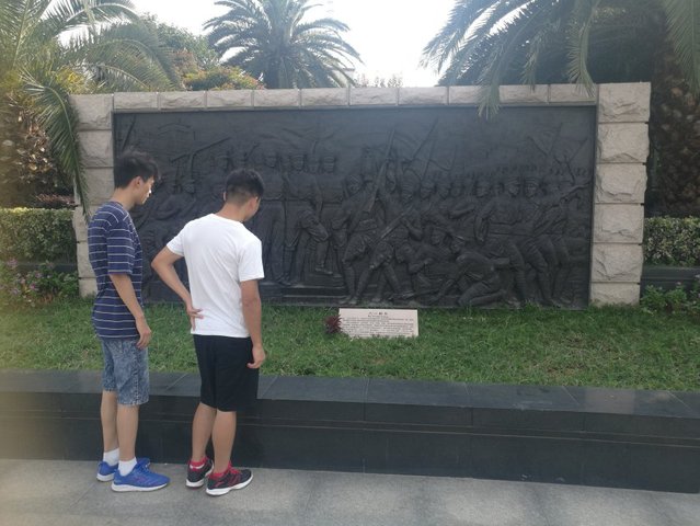 首先,团队来到八一广场。整个广场的布局是“八块浮雕”围绕着中心的“八一起义纪念塔”,蕴含着“八一”之意。南面设置了升旗台,在其北侧的汉白玉则镌刻着题词,气势恢宏,庄严深刻。浮雕记载了从“南昌起义”到“钢铁长城”的八个军事题材,图文并茂。队员们在每一个浮雕前驻足,仔细地观看,相互交流自己的想法。随后,大家来到纪念塔下方,瞻仰这座八一广场标志性的建筑。塔座正面刻着“南昌八一起义简介”碑文,塔身正面为“八一南昌起义纪念塔”铜胎鎏金大字,在阳光下熠熠生辉,其它三面皆为人物浮雕。塔顶由由一支直立的巨型汉阳造步枪与一面八一军旗组成,寓意深刻。参观结束后,队员们在纪念塔下合影留念。