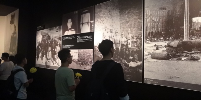 正式开展实践之前,实践团进行了计划的商讨与行程的安排。随后,实践团于24日上午前往侵华日军南京大屠杀遇难同胞纪念馆开展实践活动。侵华日军南京大屠杀遇难同胞纪念馆坐落在南京市江东门,曾是侵华日军集体屠杀遗址及遇难者丛葬地,是国际公认的二战期间三大惨案纪念馆之一。1937年12月13日至1938年11月侵华日军攻占南京后制造惨无人道的南京大屠杀暴行,三十万同胞惨遭不幸。队员们手持鲜花仔细观看了每一件展品,一张张牺牲于战场上的将士照片、一件件史实资料及“万人坑”的遇难者遗体将南京大屠杀的惨烈呈现在队员们面前。