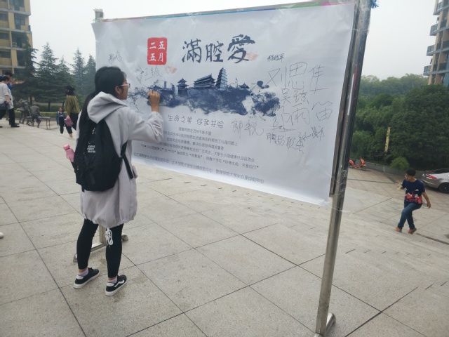 活动筹备初期,心助制作了签名用的展板,组织策划了活动小游戏并为此准备活动礼品。中午12点,在负责人的带领下,参与本次活动的工作人员于二食堂广场准时集合。活动前各项准备工作就绪后,本次活动正式开始。工作人员主动上前向路过的学生们耐心而认真的介绍大学生心理健康日,就心理健康日的主题,活动的形式等方面的内容及注意事项进行了简单的概述,并向对此活动感兴趣的同学分发了宣传单。不少同学表示对本次活动感兴趣,纷纷主动在展板上签名并参加小游戏,在卡片上写上心灵鸡汤、心理小故事、激励心灵的话语。约五十分钟后,心里自助中心将事先准备的宣传的分发完毕,并进行合影留念,本次活动正式结束。