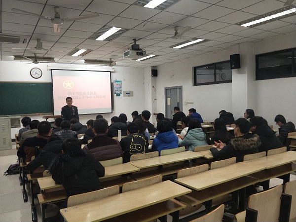 团委副书记兰东昊对各班团支书前半年的工作进行总结。在兰东昊的工作总结中,他首先提出了在各团支部刚刚举办过的12.9系列团日活动中存在的问题,如活动形式单一、开办地点单一、人员出勤率低等等。之后,他又根据过去举办团日活动的一些经验与团委老师提出的建议等,针对这些问题提出了一些具体的解决方案,同时也对各团支书提出了更加清晰的工作要求明细。接下来,部分工作做地较好的团支书上台进行关于团日活动的工作心得分享。在他们的分享报告中,与班委的合作、对每一个同学的重视、对团日活动的精心设计这三项被列为了重点。最后,由团委组织部部长对本次会议进行最后的总结,他提出了一些关于团日活动举办的一些建议,同时也对各团支部2018年的工作做出要求与展望。