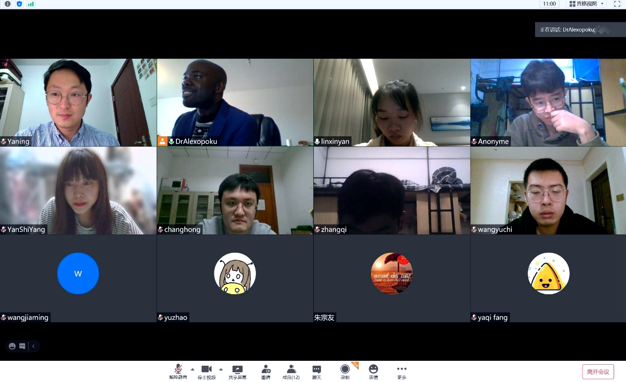 因为疫情原因,本课程采用腾讯会议线上远程教学,并采用小班制教学。该课程以全英文方式进行交流互动学习并采用翻转课堂形式,讲课过程中穿插了大量的师生互动及问答环节,突出体现了以学生为中心的教学方法。Opoku教授通过通俗易懂的模型制作、网络工具的应用以及简单的相关例子将复杂的知识点简化。