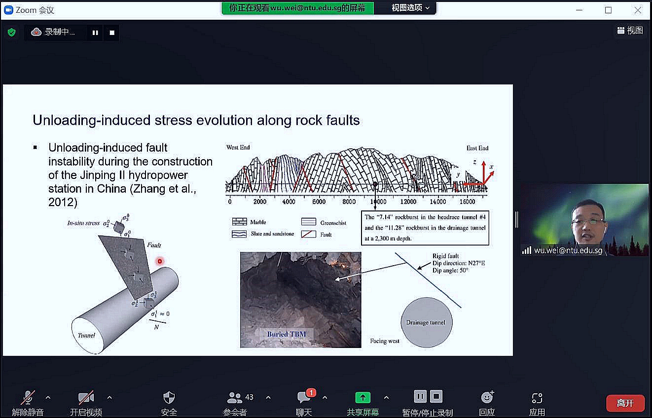 煤炭资源与安全开采国家重点实验室蔡武副研究员作了题为“断层型地热储层中流体注入与诱发地震活动的相关性:来自数据驱动分析和数值模拟的见解”的报告,山东大学王汉鹏教授作了题为“多应变率动静荷载叠加岩石力学实验关键技术的报告”,俄罗斯圣彼得堡矿业大学Alexandr S. Egorov教授作了题为“欧亚大陆北部胶结基底与台地盖层的构造分类与深部构造”的报告。